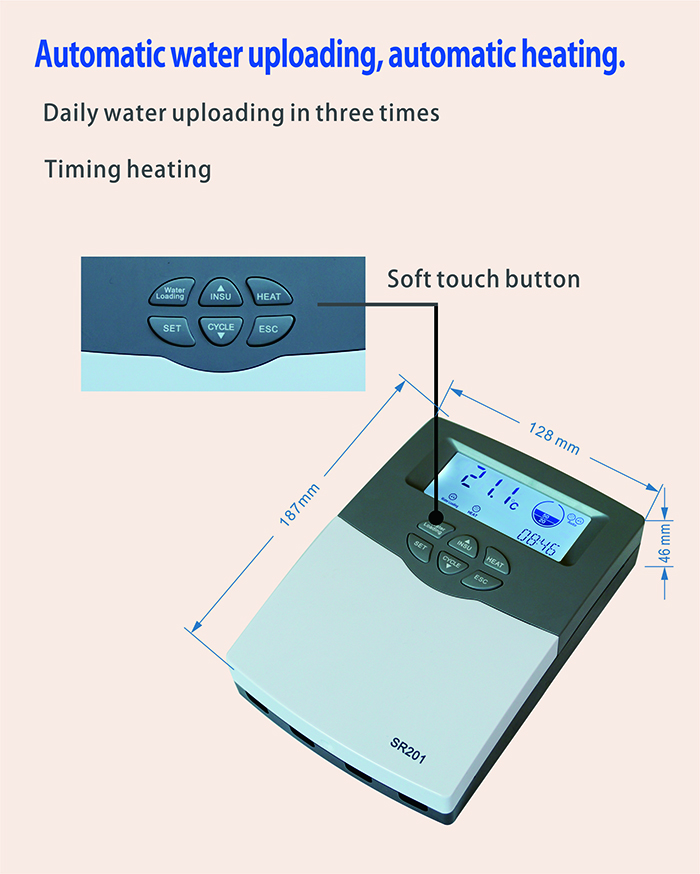 SR201 is controller with micro-computer-full-automatic used for integrated non pressure solar water heater. It is developed with high-performance 32-bit single-chip microcomputer to realize intelligent control. All devices adopt industrial standard, and can operate freely in cold, high temperature and humid environment.
